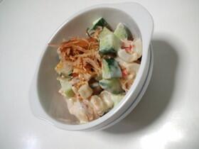 【コロコロ和風マヨサラダ】きゅうり、ちくわ、カニカマを好みの大きさに切り、マヨネーズで和える。めんつゆ小さじ1とかつおぶし3gを加えてさらに混ぜる